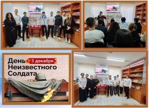 К этой памятной дате Дружненская сельская библиотека провела патриотический час «Никто не забыт, ничего не забыто». В ходе мероприятия присутствующим было рассказано, почему именно 3 декабря в России отмечается День Неизвестного Солдата, о мемориале «Могила Неизвестного солдата». На мероприятии ребята узнали о бессмертном подвиге народа, о героической защите от фашистских захватчиков, о солдатах, не вернувшихся с войны.