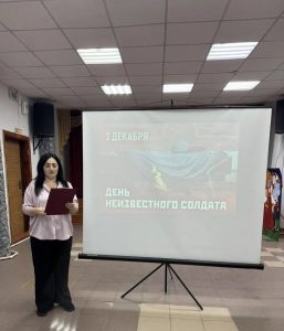 К этой памятной дате Дружненская сельская библиотека провела патриотический час «Никто не забыт, ничего не забыто». В ходе мероприятия присутствующим было рассказано, почему именно 3 декабря в России отмечается День Неизвестного Солдата, о мемориале «Могила Неизвестного солдата». На мероприятии ребята узнали о бессмертном подвиге народа, о героической защите от фашистских захватчиков, о солдатах, не вернувшихся с войны.