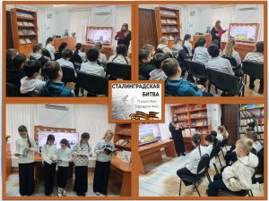 К этой памятной дате Дружненская сельская библиотека провела патриотический час «Сталинград, мы тобою гордимся!». В ходе мероприятия присутствующих познакомили с хронологией событий самой масштабной битвы Великой Отечественной войны, которая и определила её исход. Юные читатели узнали, почему так важно было немецкому командованию захватить этот город. Сколько людей и военной техники было брошено для достижения этой цели. И почему так важно было бойцам Красной Армии не отдать Сталинград врагу. С помощью фото и видеоматериалов того времени ребята смогли увидеть катастрофически разрушительную силу войны. За каждой фотографией и каждым видеокадром стояла бесценная человеческая жизнь… Вспомнили героев, отдавших жизнь за победу, вспомнили их подвиги, вспомнили неизвестных, ушедших в вечность, но подаривших нам мир!