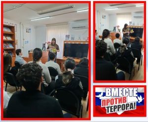 В рамках деятельности по профилактике терроризма и экстремизма в Дружненской сельской библиотеке была проведена профилактическая беседа «Библиотеки против террора». В ходе беседы библиотекарь рассказала присутствующим о значении слова «терроризм», о его типах и целях, о том, как вести себя, если слышны выстрелы, что делать с незнакомыми предметами и т. д. Ребята познакомились с правилами поведения в общественных местах, безопасности на улицах, в общественном транспорте. В завершение мероприятия библиотекарь детям раздала памятки «Осторожно, терроризм», содержащие информацию о действиях при угрозе теракта, номера телефонов для экстренного реагирования, о том, что делать при обнаружении взрывного устройства и как вести себя в данной ситуации.